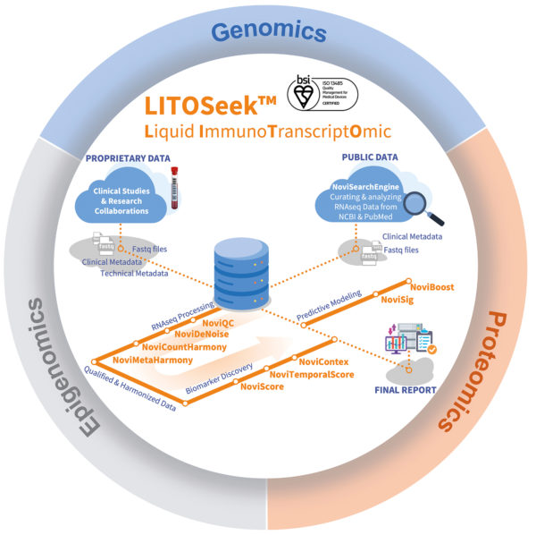 Traditional tumor biopsy techniques, while informative, face limitations due to tumor heterogeneity and accessibility challenges at various metastatic sites throughout a patient’s treatment journey. Advances in next-generation sequencing technology (NGS) have enabled the development of non-invasive methods for blood-based biomarker detection, commonly referred to as a liquid biopsy (LBx). Novigenix’s pioneering liquid biopsy technology platform LITOSeek™ (Liquid ImmunoTranscriptOmics) leverages whole-blood LBx RNA-sequencing to capture patient-specific transcriptomic profiles. By integrating next-generation sequencing and AI technologies, LITOSeek™ excels in discovering robust blood-based RNA biomarkers and creating precise, specialized predictive models. Furthermore, the platform integrates LBx genomic mutations (ctDNA) for multimodal assessment of disease with unprecedented predictive capabilities, and it is compatible with other omics data such as methylation and proteomics for comprehensive assessment of patient profiles.