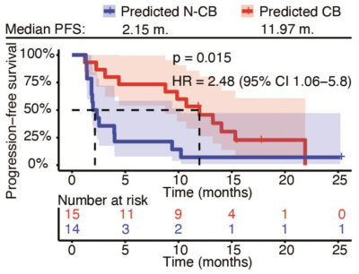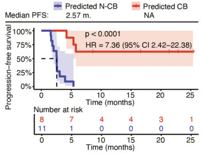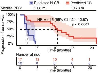 LITOSeek™ NoviSig feature reduction machine-learning algorithms identified a set of 10 genes related to relevant group comparisons and central biological pathways for downstream modeling. Predictive models developed based on these 10 early-response biomarkers were trained with NoviSig algorithms, and their performance was evaluated in the confirmation and blinded, independent validation cohort. The Kaplan-Meier curve illustrates the predictive power of LITOSeek™ in stratification of patients into those with clinical benefit (CB) and those without (N-CB).