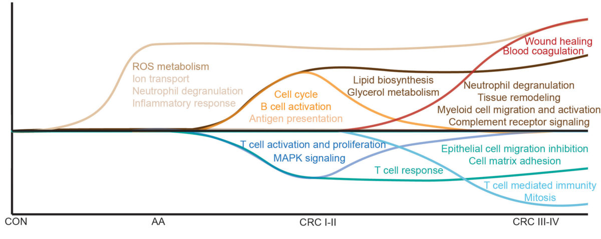 Source: Martinez-Usatorre A. et al. Human blood cell transcriptomics unveils dynamic systemic immune modulation along colorectal cancer progression.
